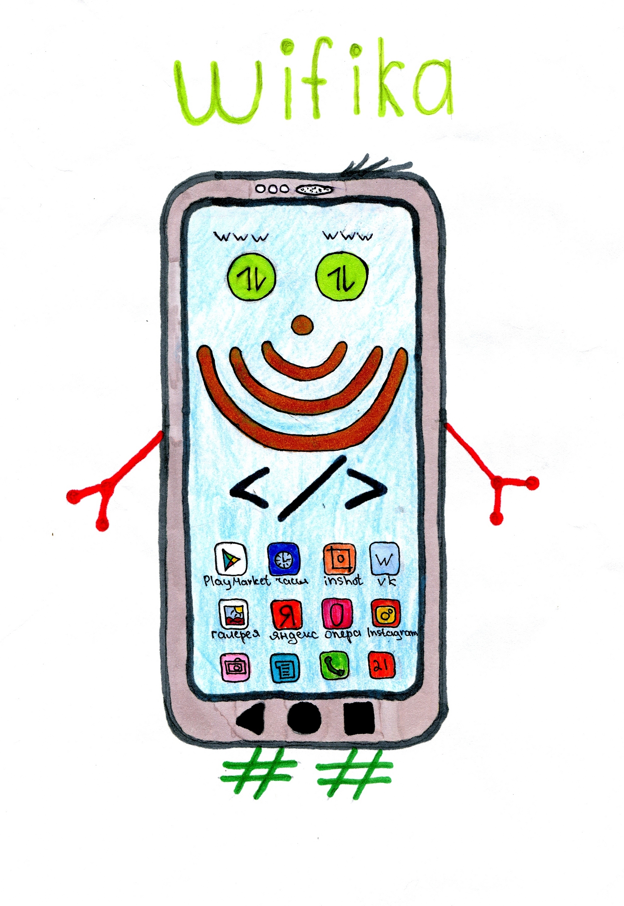 Маскот WIFIка ...Наш маскот - смартфон, т.к. сегодня это самое популярное и доступное устройство для выхода в сеть. WIFIка открывает окно в виртуальный мир, дает возможность изучать новые технологии; он отзывчивый, крутой, полезный, быстрый